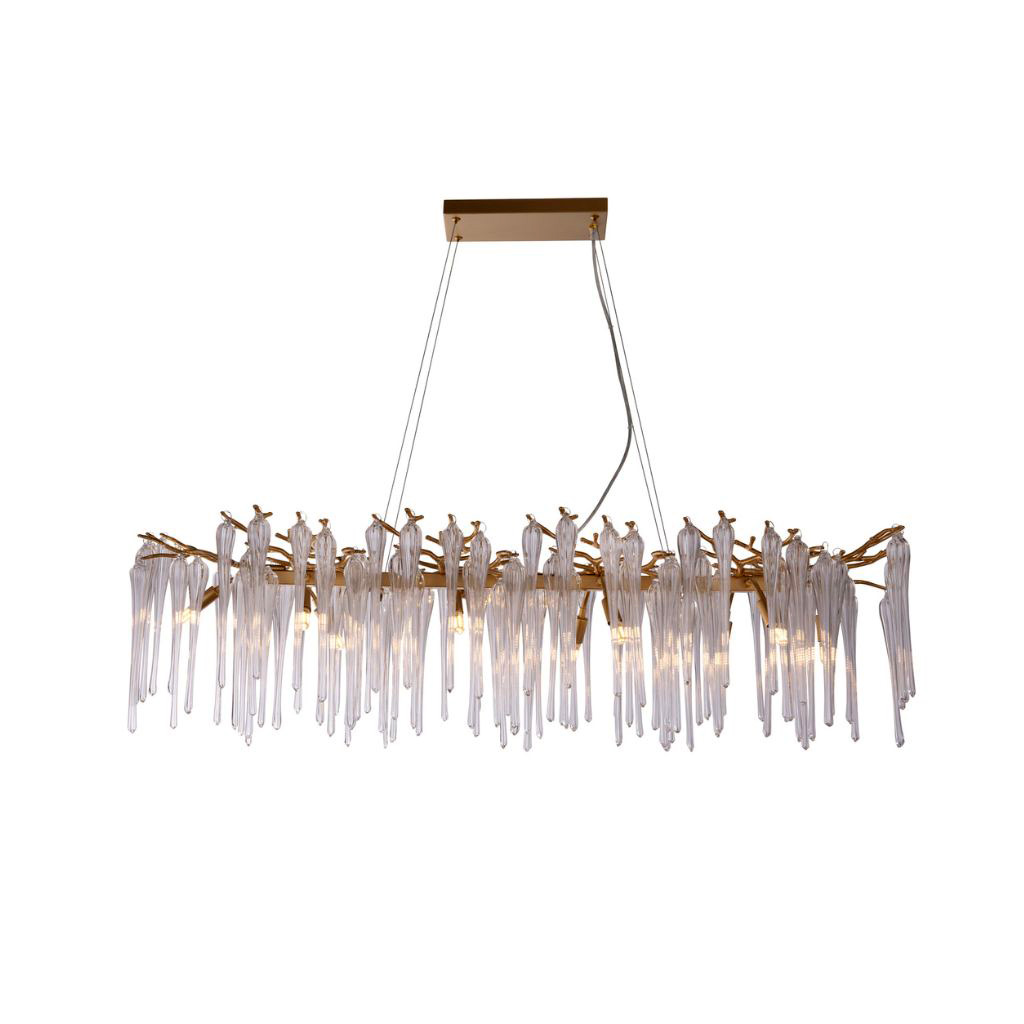 Searchlight závěsné svítidlo barva zlatá, povrchová úprava barvení, použitý materiál je měkká ocel a sklo. Rozměry v cm: celková výška: 150, výška: 31, šířka: 43, délka: 117, projekce: 0. Světelný zdroj objímka G9, potřeba žárovek 10, světelný zdroj není v balení, doporučený typ žárovky od výrobce je G9 na max. 33W.