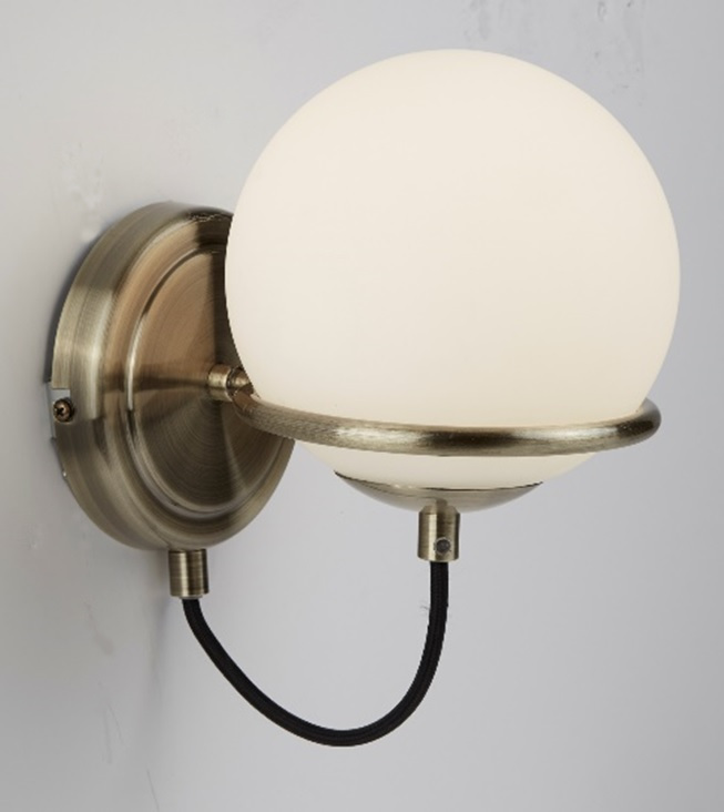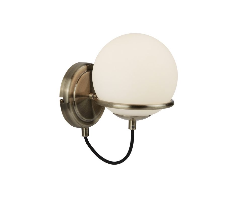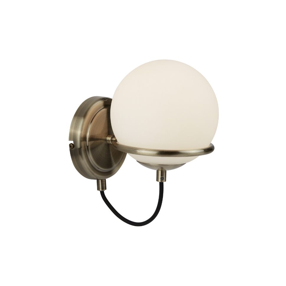 SPHERE 1x zdroj, přisazené svítidlo na stěnu, antická mosaz, černě opletený kabel, opálově bílé sklo stínítka