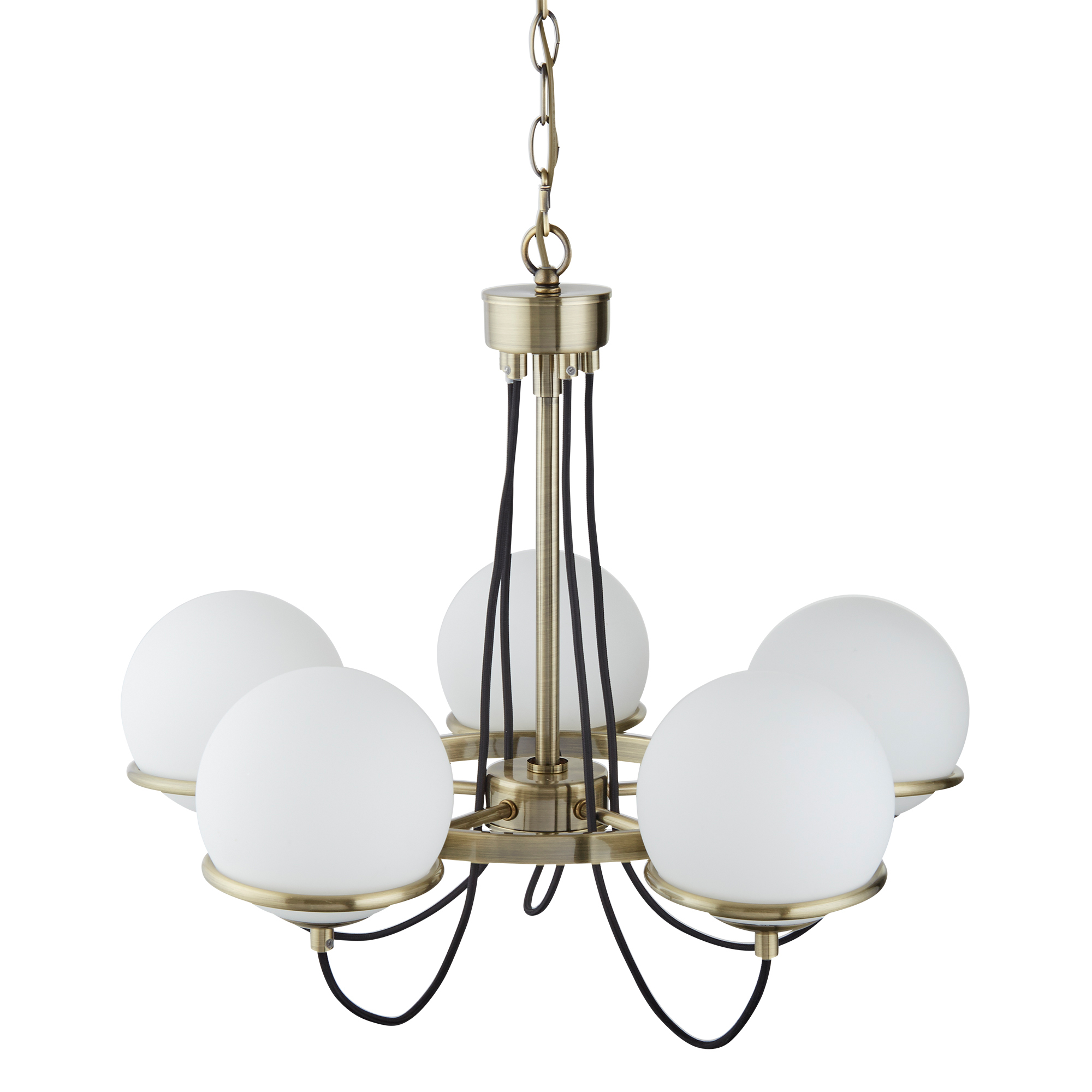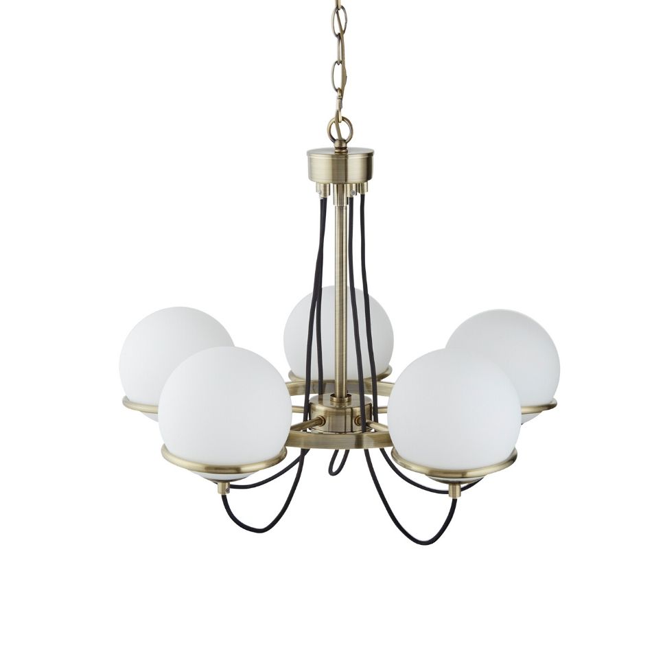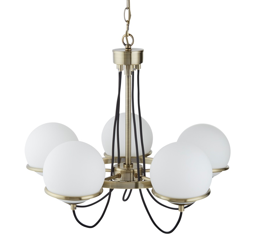 SPHERE 5x zdroj, závěsné svítidlo, antická mosaz, černě opletený kabel, opálově bílé sklo stínítka