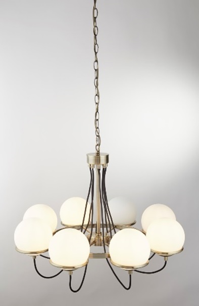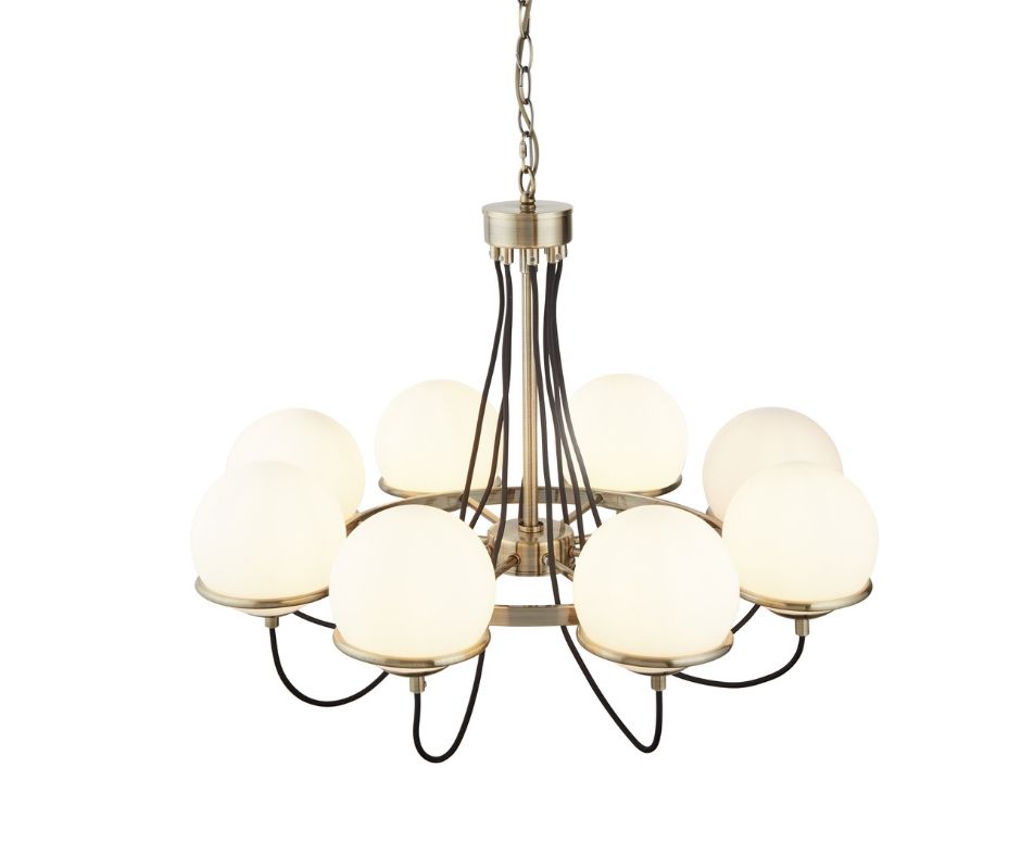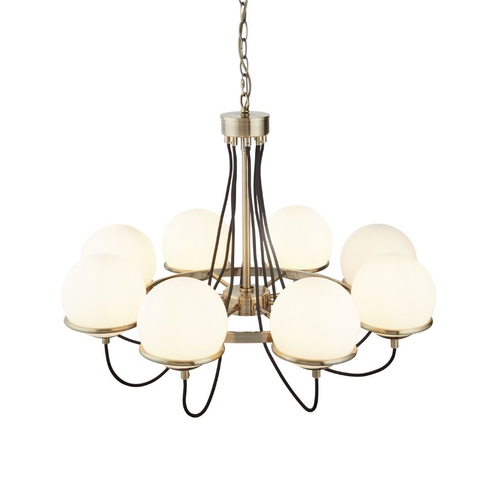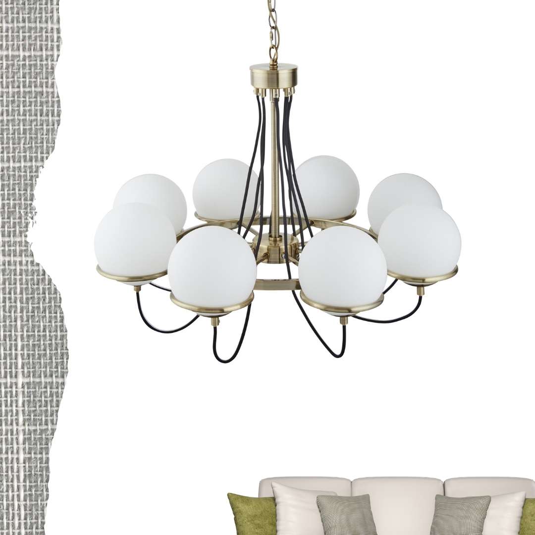 SPHERE 8x zdroj, závěsné svítidlo, antická mosaz, černě opletený kabel, opálově bílé sklo stínítka