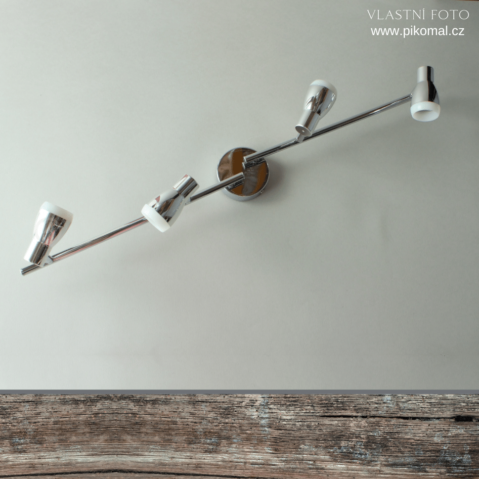 Bodovky - Lišta čtyřka, spoty na dvou ramenech. Ta jsou v lesklém chromu, stínidlo je akryl na rozptýlení světla.