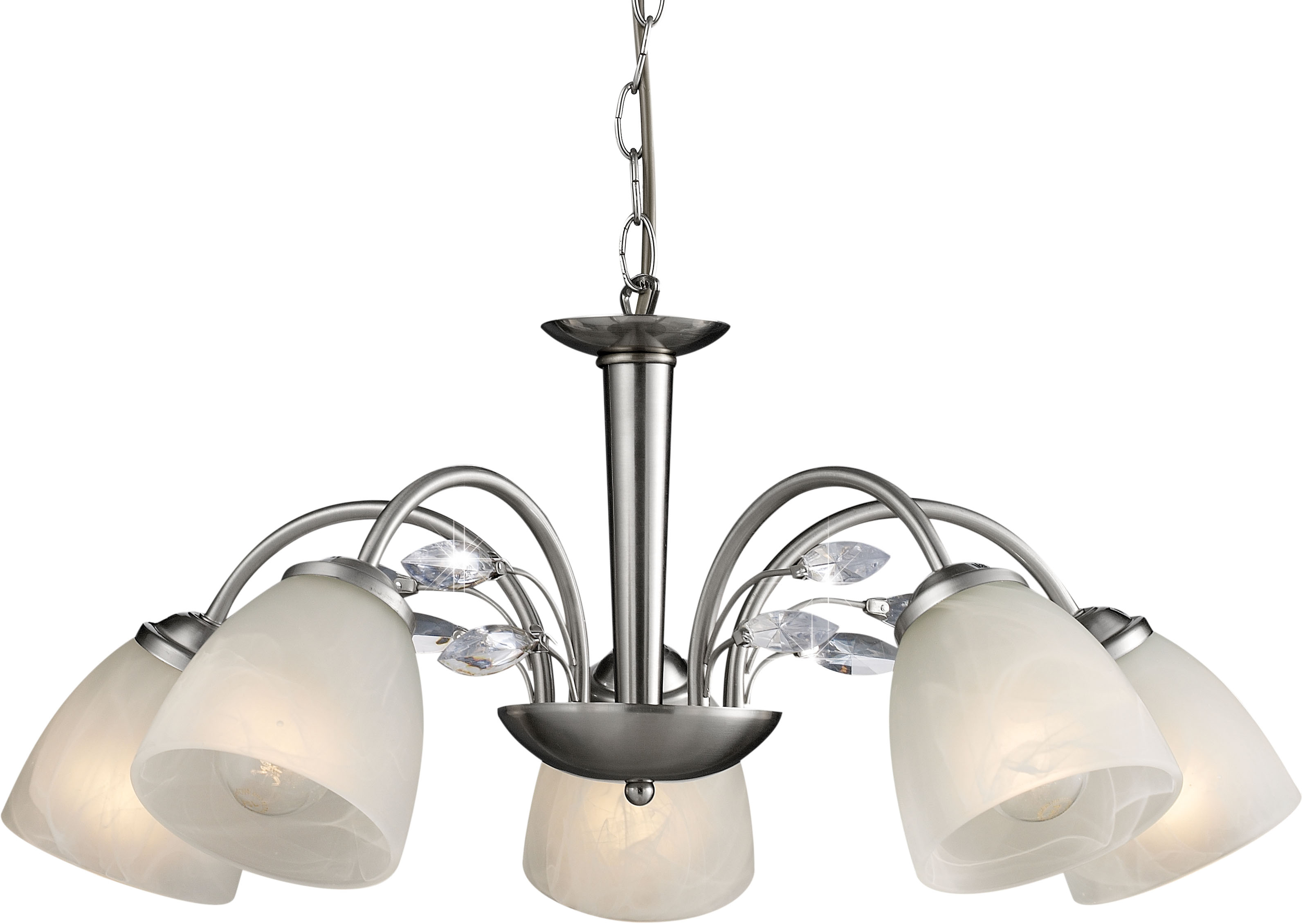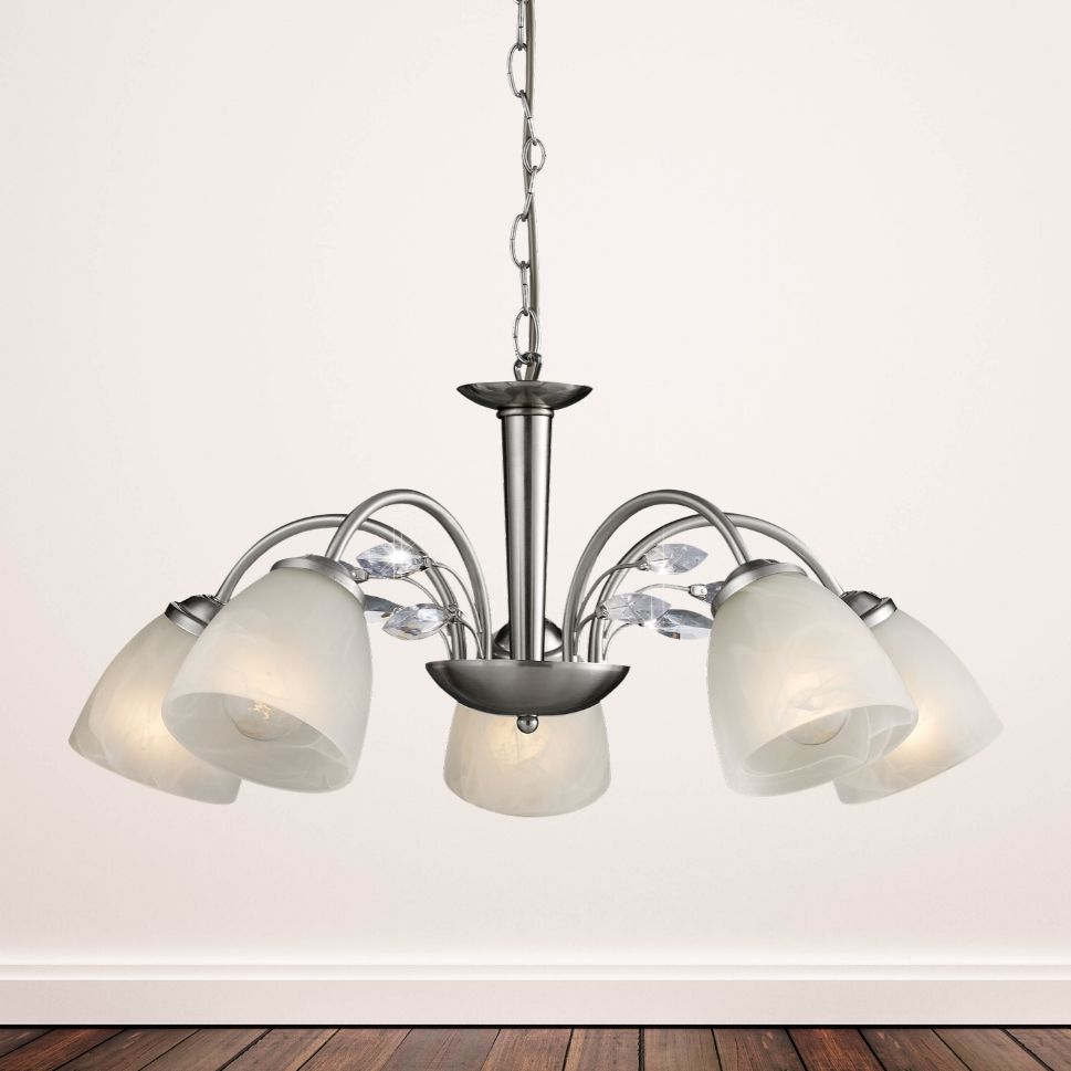 Jednoduchý ramenový závěs do obývacího pokoje. Pět ramen se stínidly ze skla v alabastrovém dekoru. Ramínka zdobí jednotlivé skleněné kameny a dávají tak lustru jemný romantický podtext.