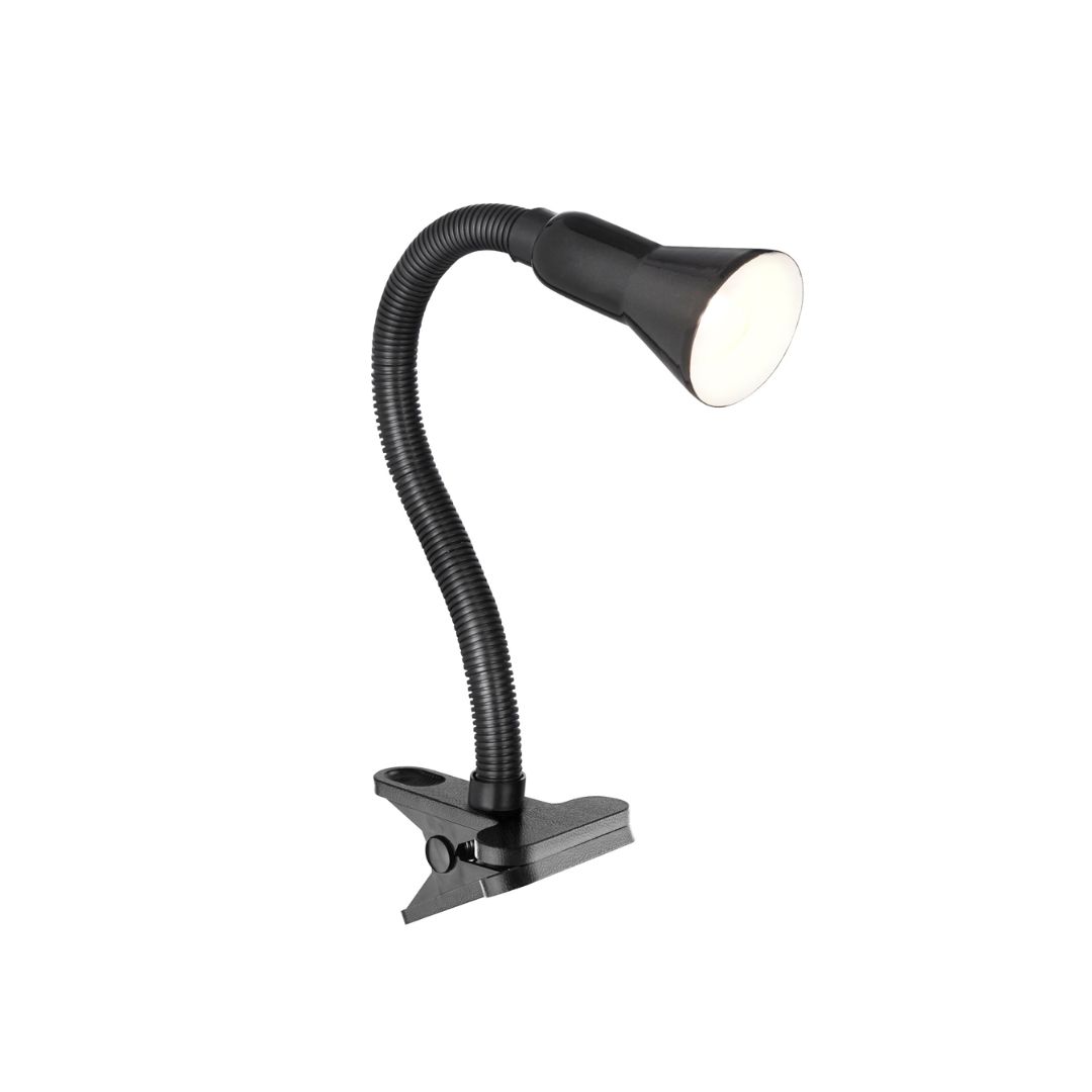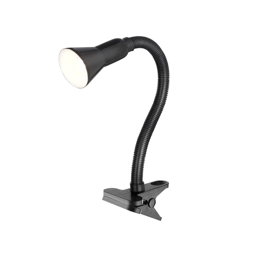 Pracovní lampa černý skřipec s flexibilním ramenem na stůl, vypínač je na kabelu. Výška je 30cm a 1xE14 max. 7W v provedení LED
