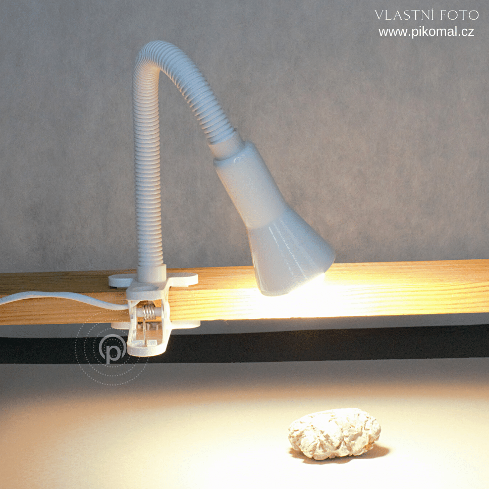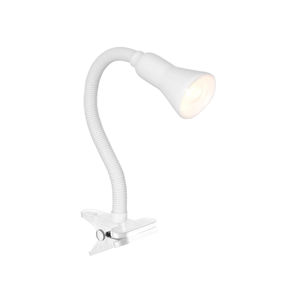 Pracovní lampa skřipec na stůl v bílé barvě s flexibilním krkem. Vypínač je na kabelu. Výška je 30cm a 1xE14 max. 7W v provedení LED