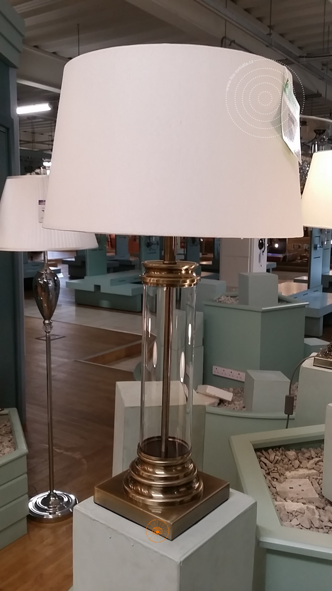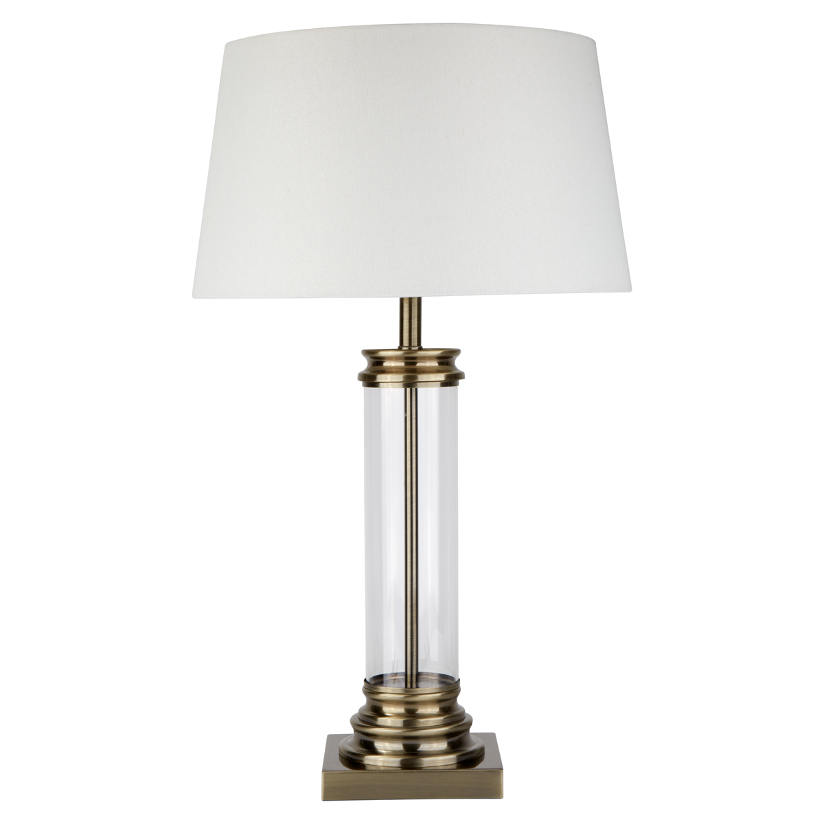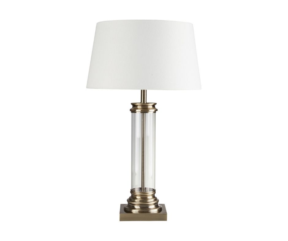 PEDESTAL stolní lampa, sklo čirý válec, antická mosaz, stínidlo barvy krému