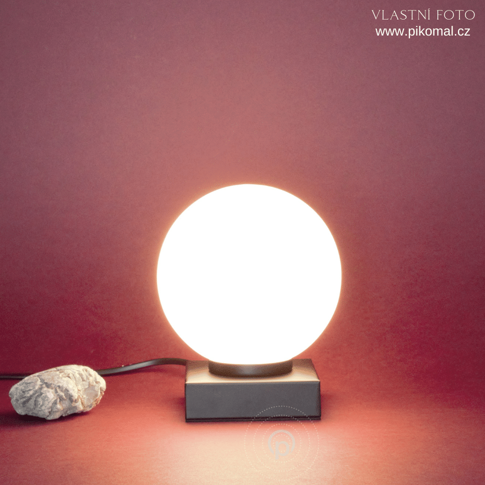 Stolní lampička kov černá barva a sklo opálové tvar koule. Výška 17,5cm, průměr 14cm. Patice pro zdroj E14 na maximální příkon 40W. Žárovka není součást balení.