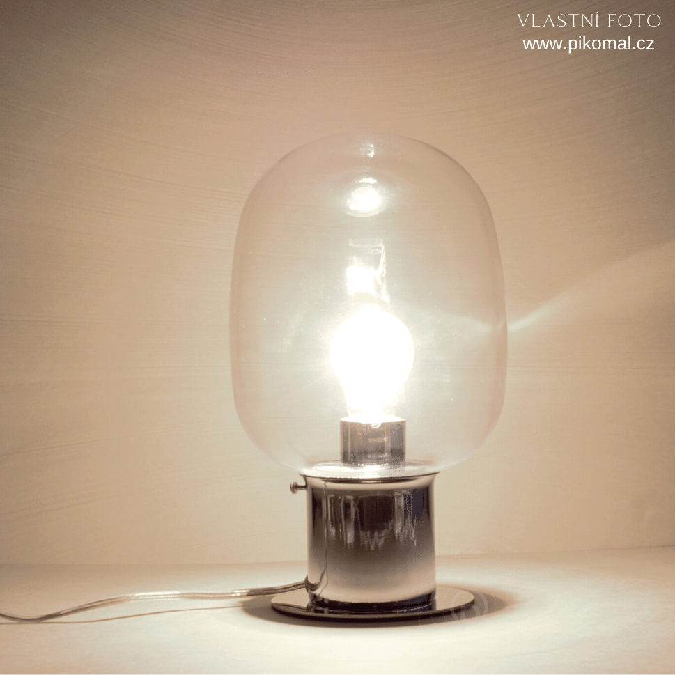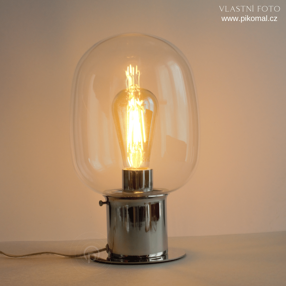 Stolní lampa kov lesklý chrom a sklo v transparentní barvě. Patice pro zdroj E27 na max. 1x25W , což u zdroje typu LED není problém. Výška je 30cm a průměr 18cm. Vypínač je kolébkový na kabelu. Zdroj není součást balení.