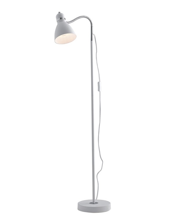 Podstava je z kovu v bílé barvě, objímka je pro žárovku s paticí E27. Stínidlo je na husím krku kovové. Snadno se nastaví jako čtečka na přímé osvětlení na stůl nebo pootočením na strop či stěnu na příjemné nepřímé osvětlení.
