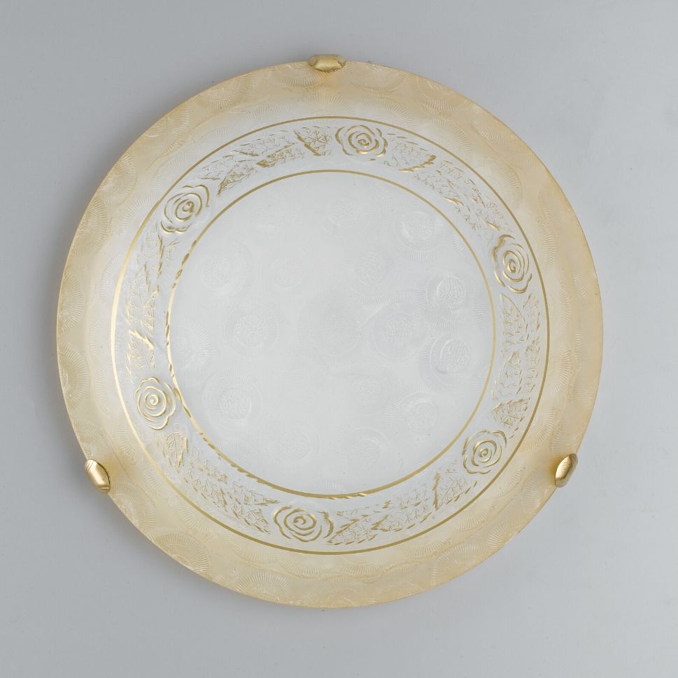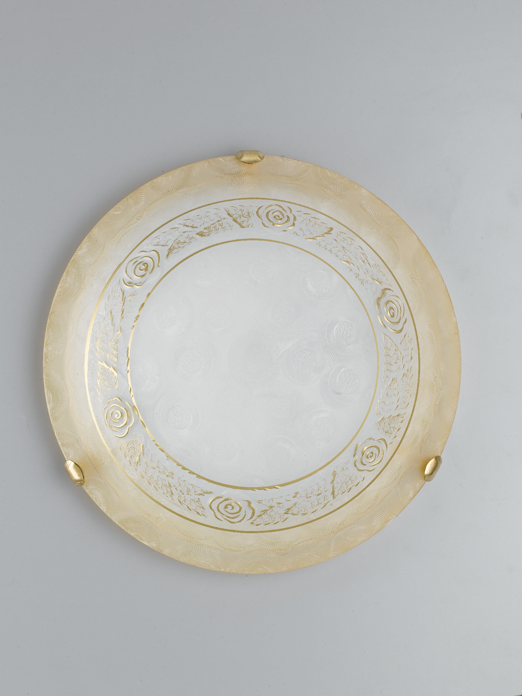 Dekorativní a výrazné stropní svítidlo do mnohých prostor. Toto je s nažloutlým ambrovým sklem s květinovým dekorem se sponkami z lesklé mosazi. Dvou žárovkové svítidlo na strop nebo stěnu.