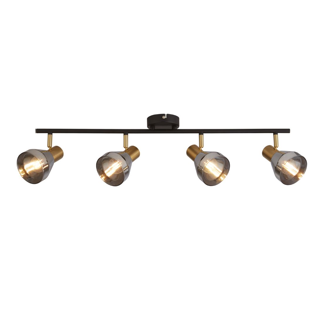 Stropní svítidlo na čtyři žárovky. Působivé svítidlo s kouřovým skleněným stínidlem na černé základně s mosaznými detaily.