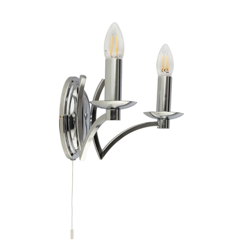 Nástěnné svítidlo kov lesklý chrom. Od stěny 19cm, výška 17cm a šířka 33cm. Patice pro zdroje E14 na max. 2x40W. Žárovky nejsou v balení. Nástěnné svítidlo je z kolekce Ascot od výrobce svítidel z Anglie Searchlight.