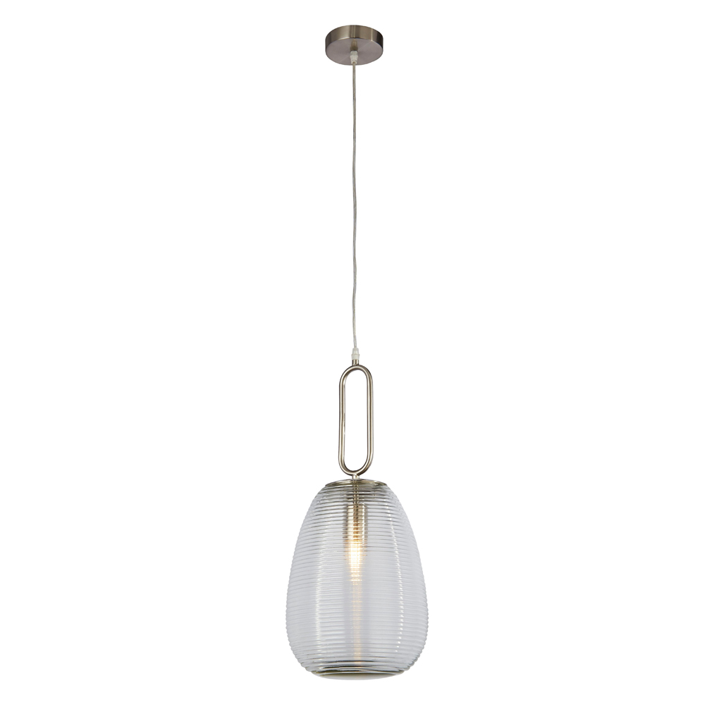 Závěsné svítidlo matný nikl barva a čiré sklo. Výška 54cm i se sklem a průměr 24cm. Od stropu 130cm. Patice pro zdroj E27 na max. 1x40W. Žárovka není součást balení. Závěsné svítidlo patří do kolekce Elixir od výrobce svítidel Searchlight.