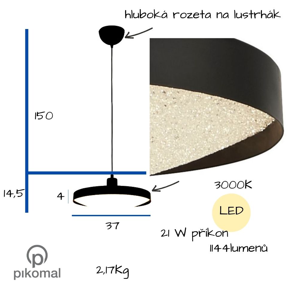 Černý závěs na kabelu kov a akryl. Průměr svítidla 35cm, od stropu 1,5metru. Světelný zdroj je integrovaný LED a svítí 3000K teplým bílým světlem. Novinka z kolekce Saucer od výrobce svítidel Searchlight.
