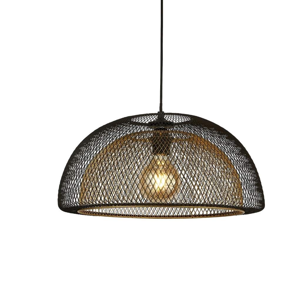 Černý závěs na černém kabelu kov se zlatavě medovou sítí. Průměr svítidla 45cm, od stropu 1,8metru. Světelný zdroj balení neobsahuje, budete potřebovat žárovku s paticí E27 na maximálně 60W. Rozeta je mělká v černé barvě s konzolkou na hmoždinky.