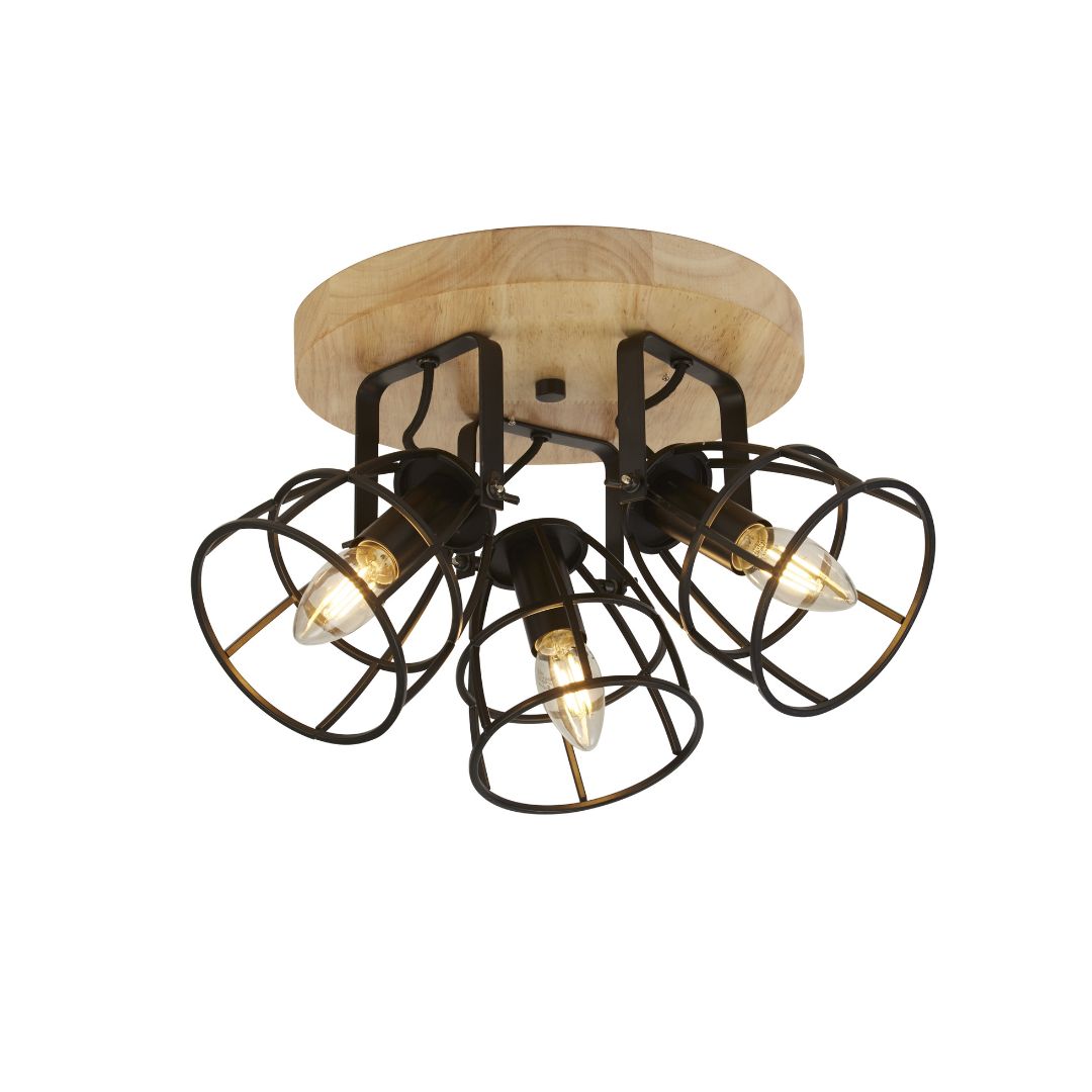 Svítidlo na strop v černé barvě ve třech stínidlech na dřevěném kruhu. Vhodný do jídelny a interiéru se skandinávským stylem.