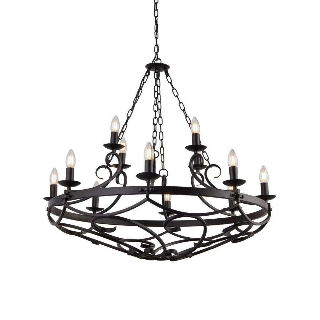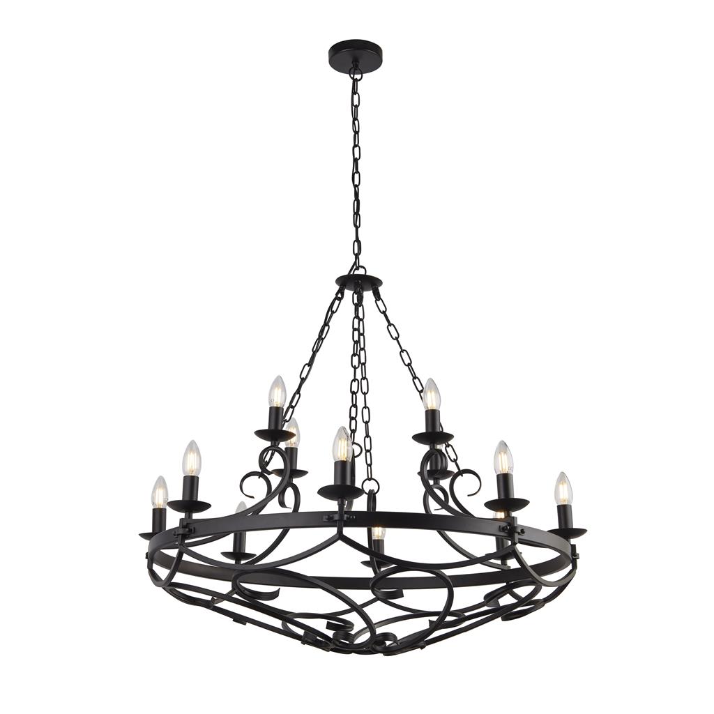 Stropní závěsné svítidlo kov černé barvy. Vypadá jako kovaný lustr. Tento je větší na dvanáct žárovek o průměru 89cm a na výšku 46cm. Žárovky nejsou součást v balení.