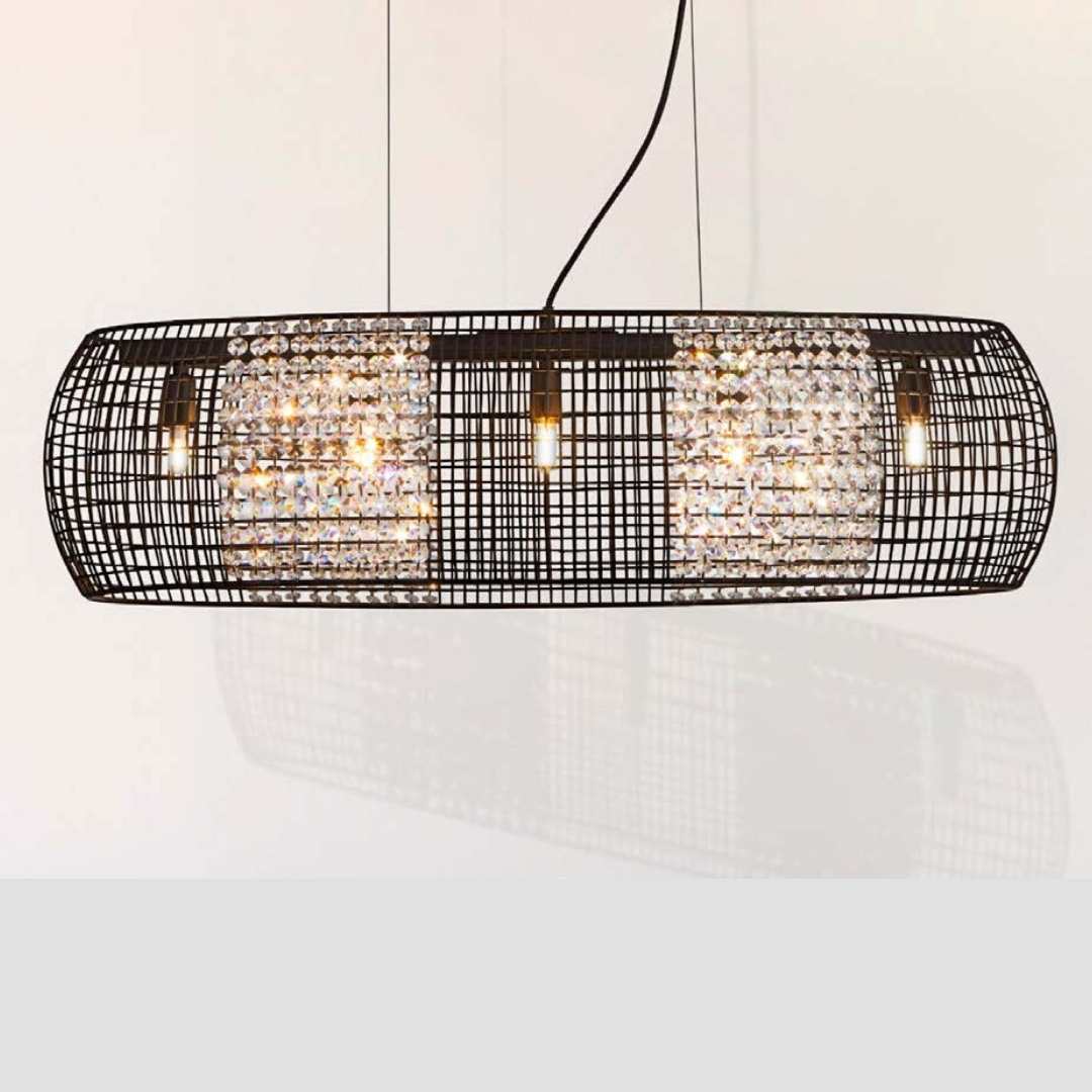 Stropní svítidlo na zavěšení do pěkné jídelny s větším stolem. Síťovaný drát je vypletený křišťálovým sklem. Délka 77cm a od stropu 150cm.