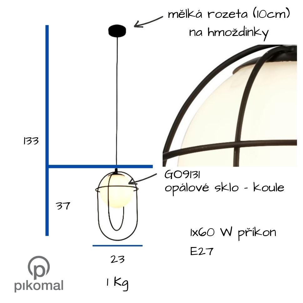 Černý závěs na černém kabelu kov a skleněná opálová koule. Průměr svítidla 23cm, od stropu 1,3metru. Světelný zdroj balení neobsahuje, budete potřebovat žárovku s paticí E27 na maximálně 60W. Rozeta je mělká v černé barvě s konzolkou na hmoždinky.
