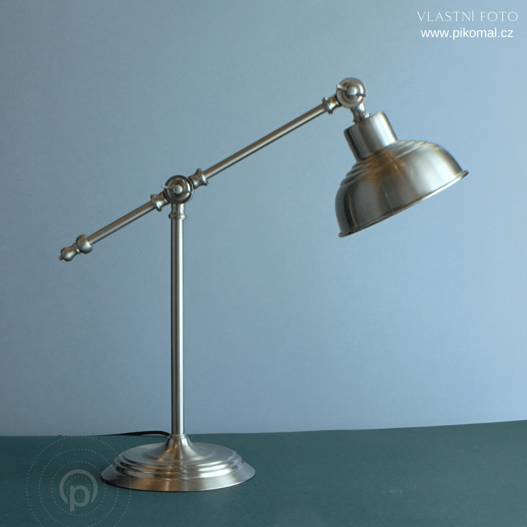 Rozměry lampičky upřesňuji. Na výšku má 35cm, pokud je rameno úplně vodorovně. Když se posune do výšky asi jako na fotografii, pak má shora 46cm. Průměr stínidla je 16cm a průměr podstavce 18cm.