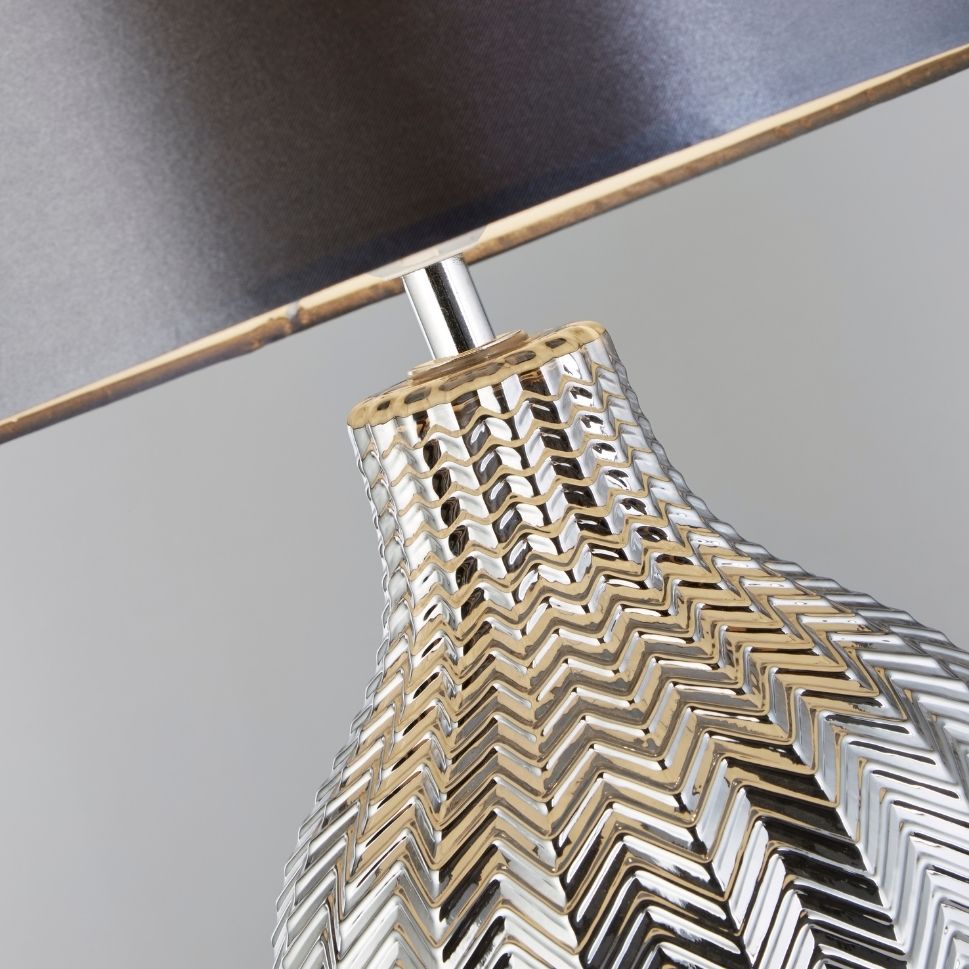 Stolní lampa kouřové barvy z textilním stínidlem v šedé barvě. Výška 53cm a průměr stínidla 33cm. Patice žárovky je E27 na max. 1x60W. Žárovka není v balení. Stolní lampa je z kolekce Chevron od výrobce svítidel Searchlight.