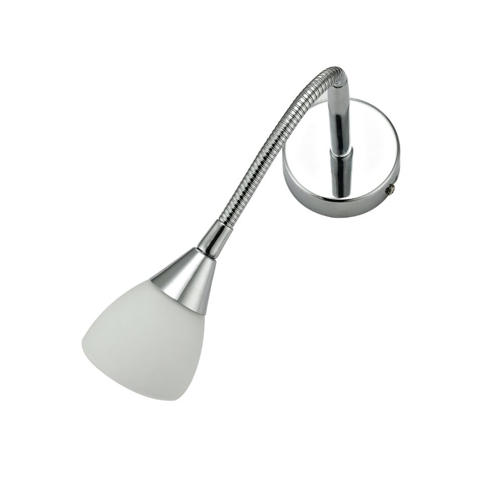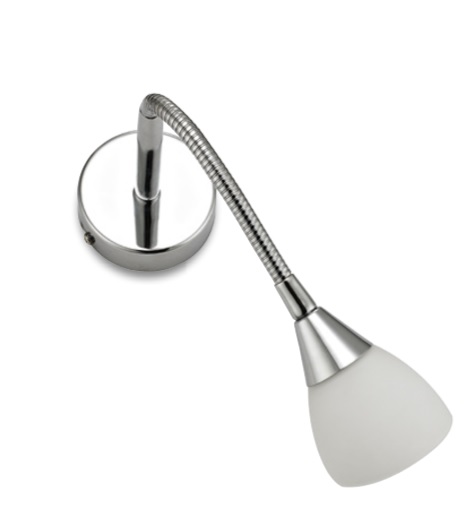 Praktické bodové svítidlo na čtení, které dobře vypadá, na svícení přímo do ruky, knihy, pletení a jiných věcí. Kovové provedení v lesklém chromu se skleněným doplňkem jako stínidlem.